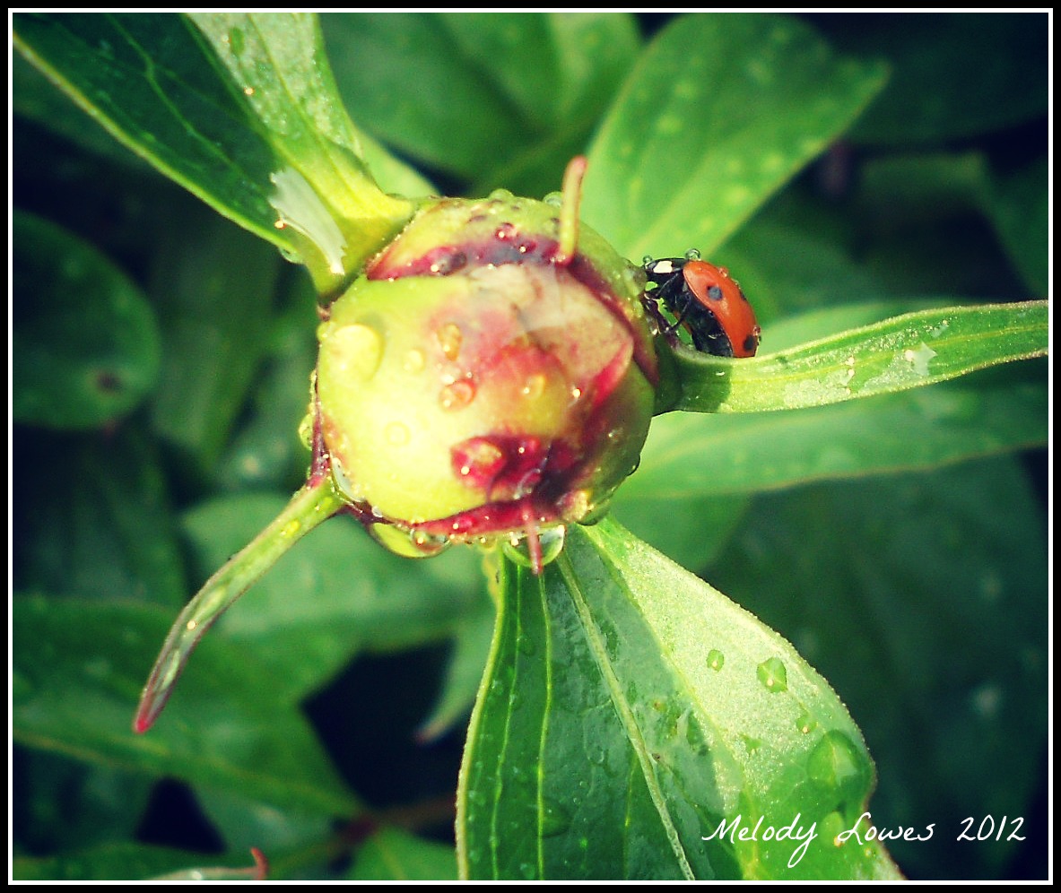 When creeping about on a rain-kissed bud?