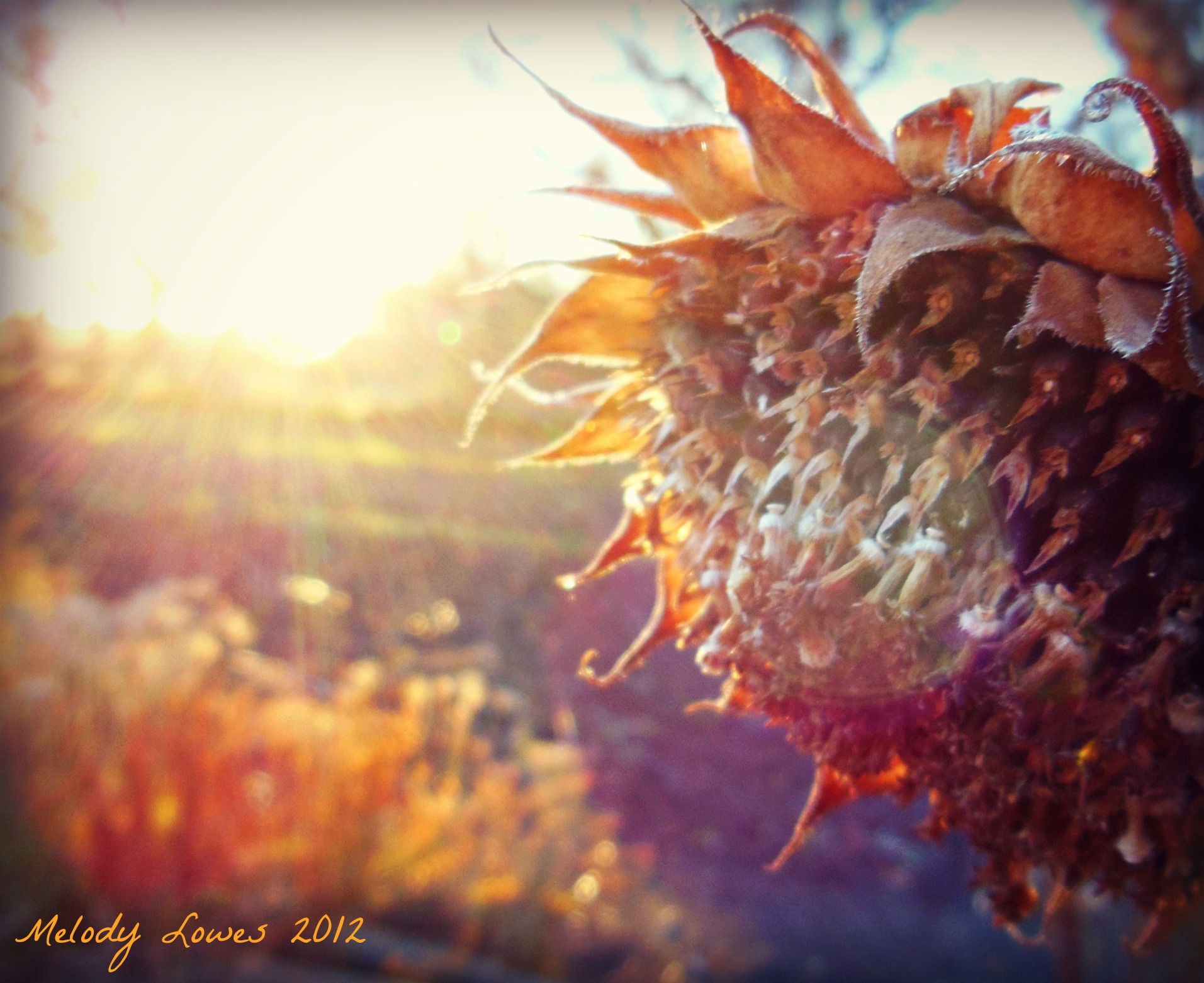 Don’t be sorry, Sunshine, though glory meets its doom; don’t grip your resentment though your smile has lost its bloom. No insects vie for pollen, no bees hang on your words, but in the sunset of your life, seeds satisfy the birds.